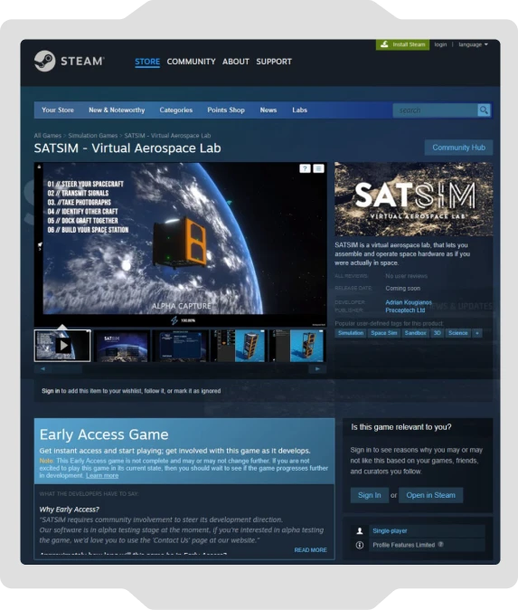 SATSIM v0.0 started with market research, determining what the market wanted to do. We determined people were interested in building items virtually. Market research survey is stil available here We've exhaustively analysted a lot of data!